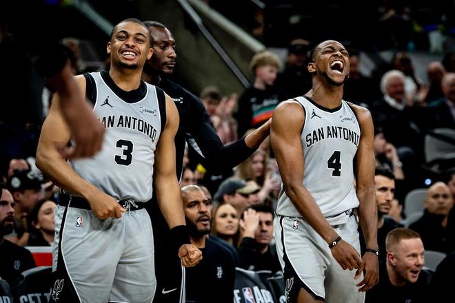 马刺队,卡斯尔13中7,三分球4中3砍下了23分3板5助,冲击力十足。福克斯15中9轰下了了20分2板10助,兼顾了得分与串联球队。凯尔登约翰逊13中8,三分球7中4得到了20分1板2助;哈珀12中8,三分球4中3砍下了19分2板6助,两人从替补席爆发。尚帕尼7中4得到11分5板4助2断、布莱恩特7分3板、瓦塞尔6中0,罚球6中5得到5分5板3助、麦克劳林3分1板1助、沃特斯3分2助、奥利尼克3分1助、科内特2分1板3助、比永博1板。